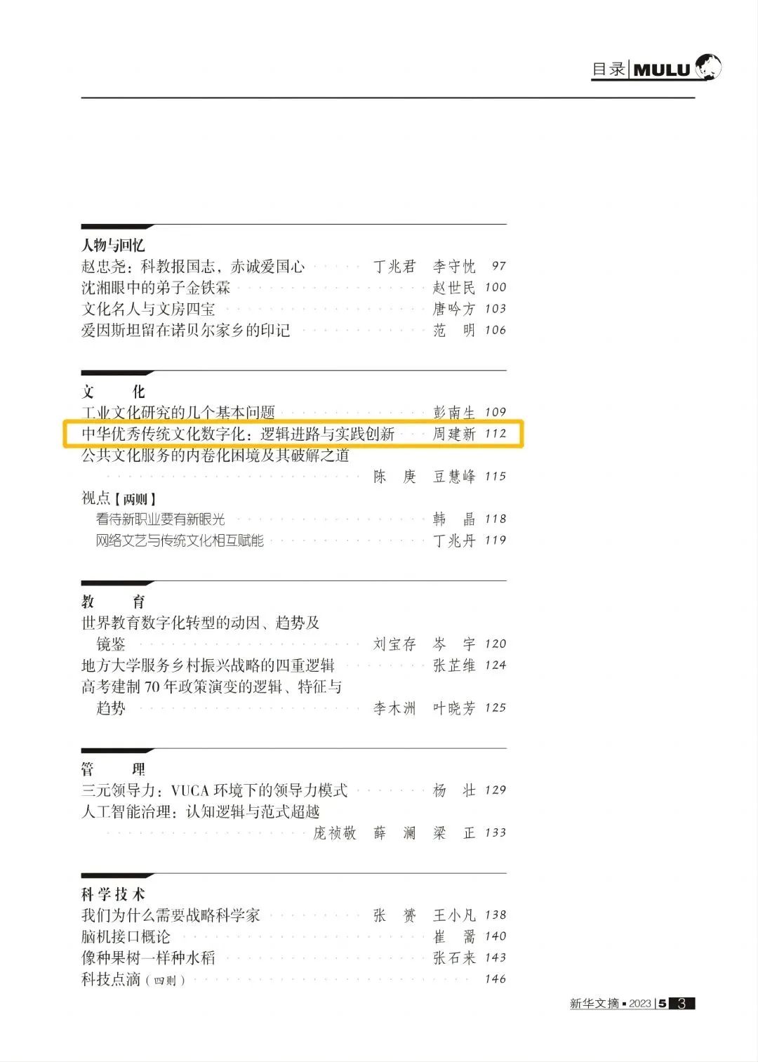 近日,我院院长周建新的文章《中国优秀传统文化数字化:逻辑进路与实践创新》被《新华文摘》2023年第5期全文转载。