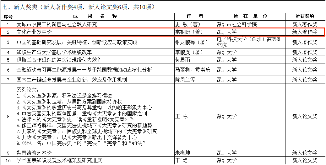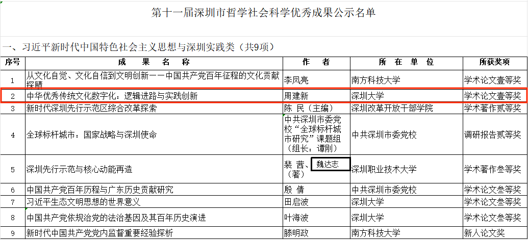 我院2项成果入选第十一届深圳市哲学社会科学优秀成果奖。我院院长周建新教授、博导的论文《中华优秀传统文化数字化:逻辑进路与实践创新》获得学术论文壹等奖,我院信息出版部主任宗祖盼副教授、博导的著作《文化产业发生论》获得新人著作奖。