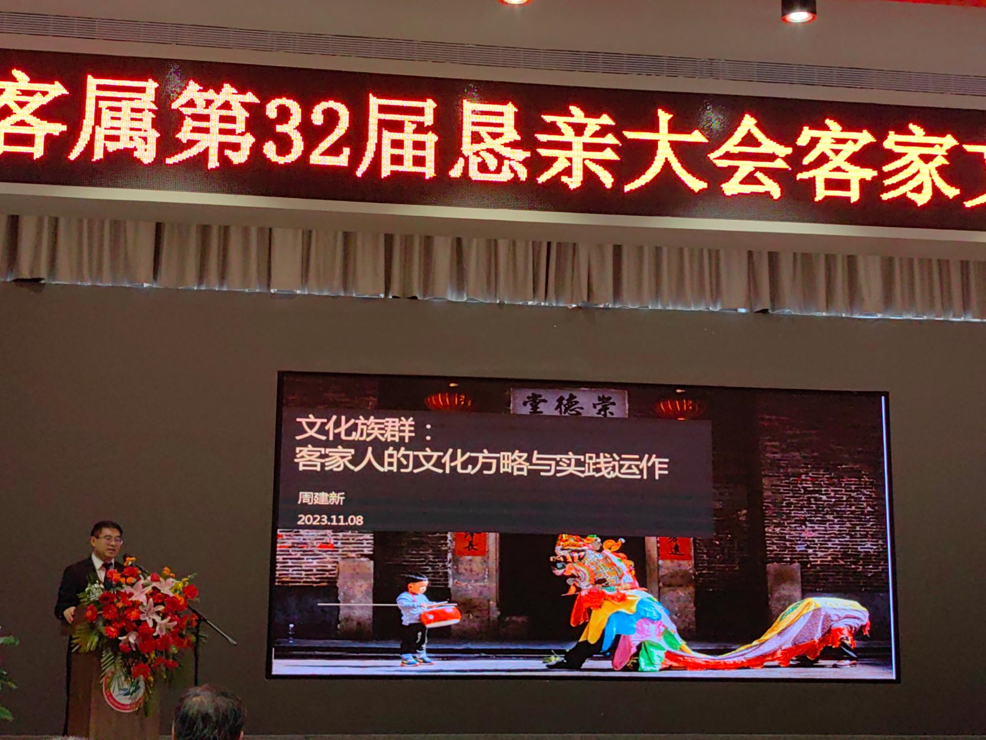 深圳大学文化产业研究院院长、客家研究所所长周建新教授应邀参加世界客属第32届恳亲大会开幕式和闭幕式等活动,并在客家文化学术交流会上作了“文化族群:客家人的文化方略与实践运作”的主旨演讲。此次客家文化学术交流会主题是“围屋之都与全球客家”,分为主旨演讲、主题发言、分组讨论以及学术总结四个部分。客家文化学术交流会集聚行业智慧,碰撞创新火花,直面发展难题,为客家围屋的保护利用及客家文化的传承发展,提供了交流合作的平台。通过嘉宾们在交流会上的智慧发声,为龙南如何发挥优势,更加科学保护、合理开发客家围屋以及龙南旅游产业高质量发展会诊把脉、出谋划策。期间还举行了武当“世界客家第一村”客家文化研究基地授牌仪式。