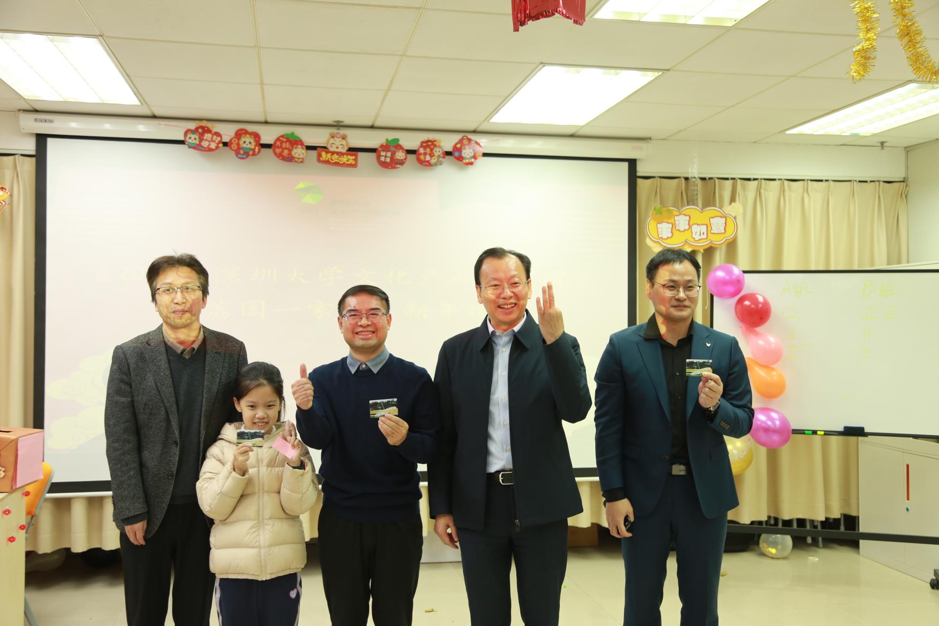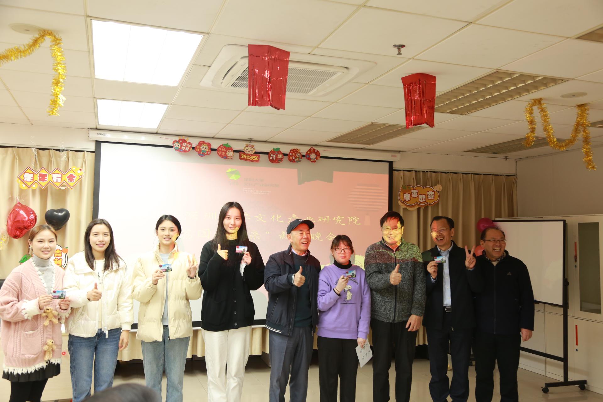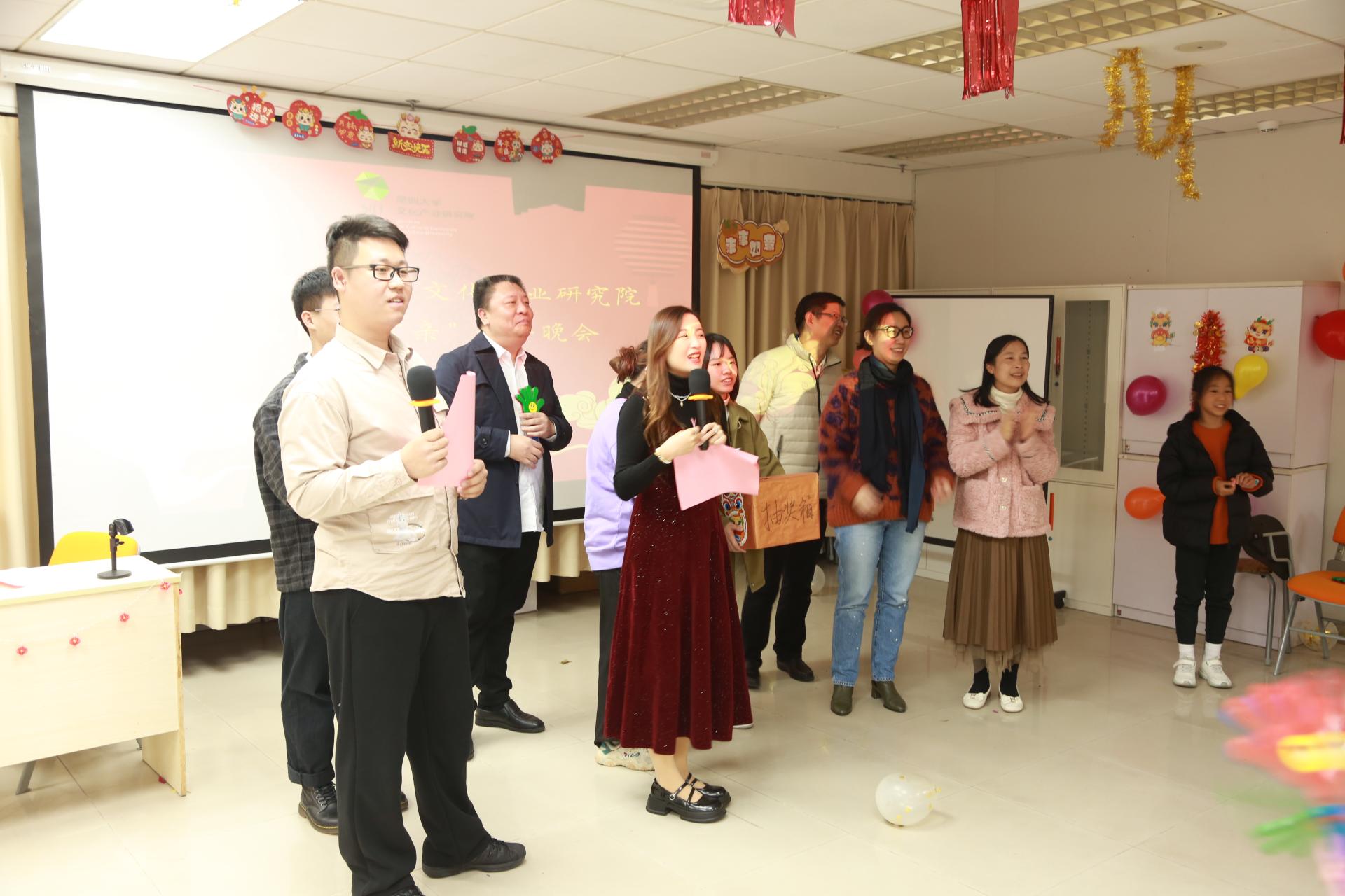 岁序更替,华章日新,2023年12月24日晚,深圳大学文化产业研究院“荔园一家亲”庆元旦暨2024新年晚会在汇文楼5楼2523-4举行。新的一年即将来临,在此辞旧迎新之际,师生欢聚一堂,共同庆祝新年的到来。华南农业大学党委书记李凤亮、美学与文艺批评研究院院长高建平、文化产业研究院院长周建新、文化产业研究院特聘教授李心峰、美学与文艺批评研究院副院长李健、文化产业研究院副院长胡鹏林,以及文化产业研究院全体师生出席参加此次晚会。