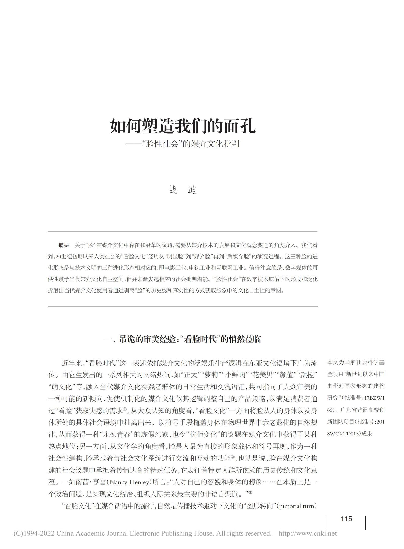 发表于《文艺研究》2019年第12期。关于“脸”在媒介文化中存在和沿革的议题,需要从媒介技术的发展和文化观念变迁的角度介入。我们看到,20世纪初期以来人类社会的“看脸文化”经历从“明星脸”到“媒介脸”再到“后媒介脸”的演变过程。这三种脸的进化形态是与技术文明的三种进化形态相对应的,即电影工业、电视工业和互联网工业。值得注意的是,数字媒体的可供性赋予当代媒介文化自主空间,但并未激发起相应的社会批判潜能。“脸性社会”在数字技术庇佑下的形成和泛化折射出当代媒介文化使用者通过剥离“脸”的历史感和真实性的方式获取想象中的文化自主性的意图。