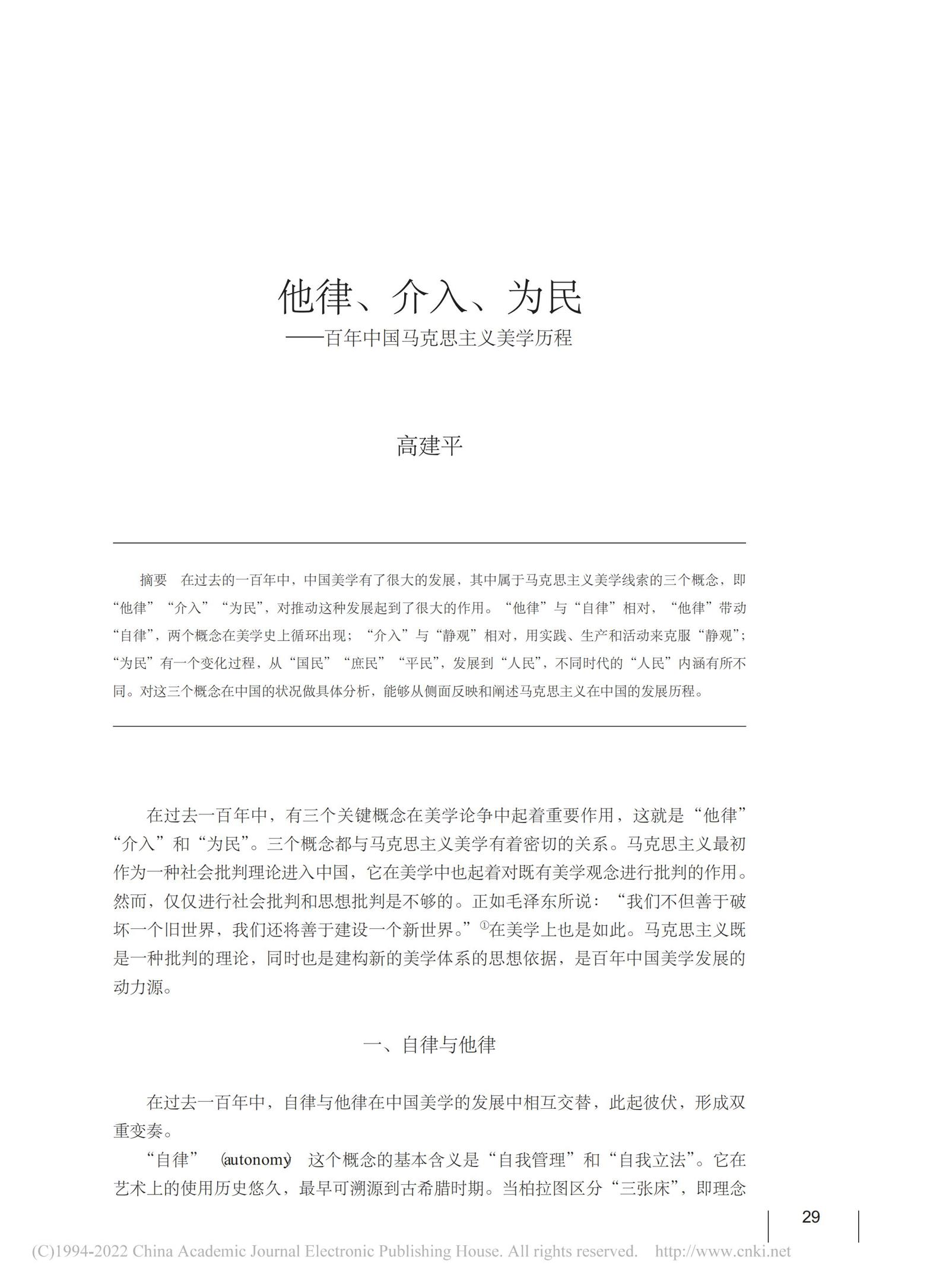 发表于《文艺研究》2021年第7期。在过去的一百年中,中国美学有了很大的发展,其中属于马克思主义美学线索的三个概念,即“他律”“介入”“为民”,对推动这种发展起到了很大的作用。“他律”与“自律”相对,“他律”带动“自律”,两个概念在美学史上循环出现;“介入”与“静观”相对,用实践、生产和活动来克服“静观”;“为民”有一个变化过程,从“国民”“庶民”“平民”,发展到“人民”,不同时代的“人民”内涵有所不同。对这三个概念在中国的状况做具体分析,能够从侧面反映和阐述马克思主义在中国的发展历程。