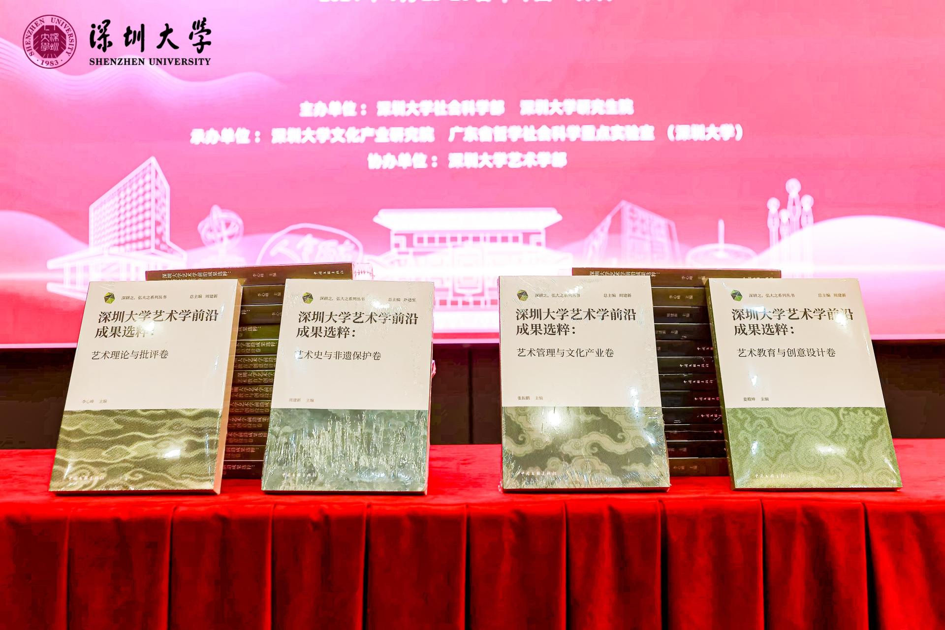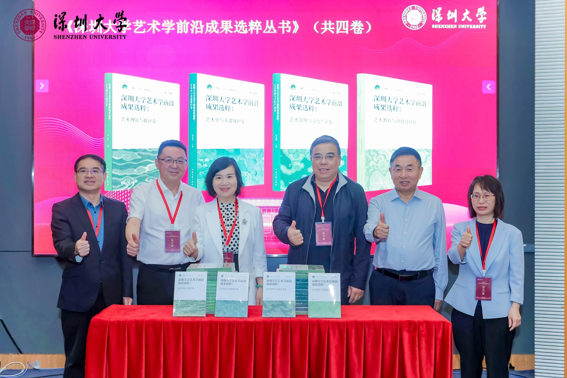 《深圳大学艺术学前沿成果选粹丛书》由深圳大学文化产业研究院于 2023 年启动编撰,以集中展示深圳大学艺术学科近年来最新代表性成果。该丛书共分四卷,由周建新总主编,共约 100 余万字,具体包括:李心峰主编《艺术理论与批评卷》、周建新主编《艺术史与非遗保护卷》、张振鹏主编《艺术管理与文化产业卷》、姜殿坤主编《艺术教育与创意设计卷》,由中国文联出版社整体推出。深圳大学副校长张晓红、国务院第七届、第八届学位委员会艺术学理论学科评议组成员夏燕靖,国务院第七届学位委员会艺术学理论学科评议组成员、中国艺术学理论学会常务副会长王廷信,中国文联出版社副总编邓友女、深圳大学研究生院院长刘永、深圳大学文化产业研究院院长周建新为《深圳大学艺术学前沿成果选粹丛书》揭幕。