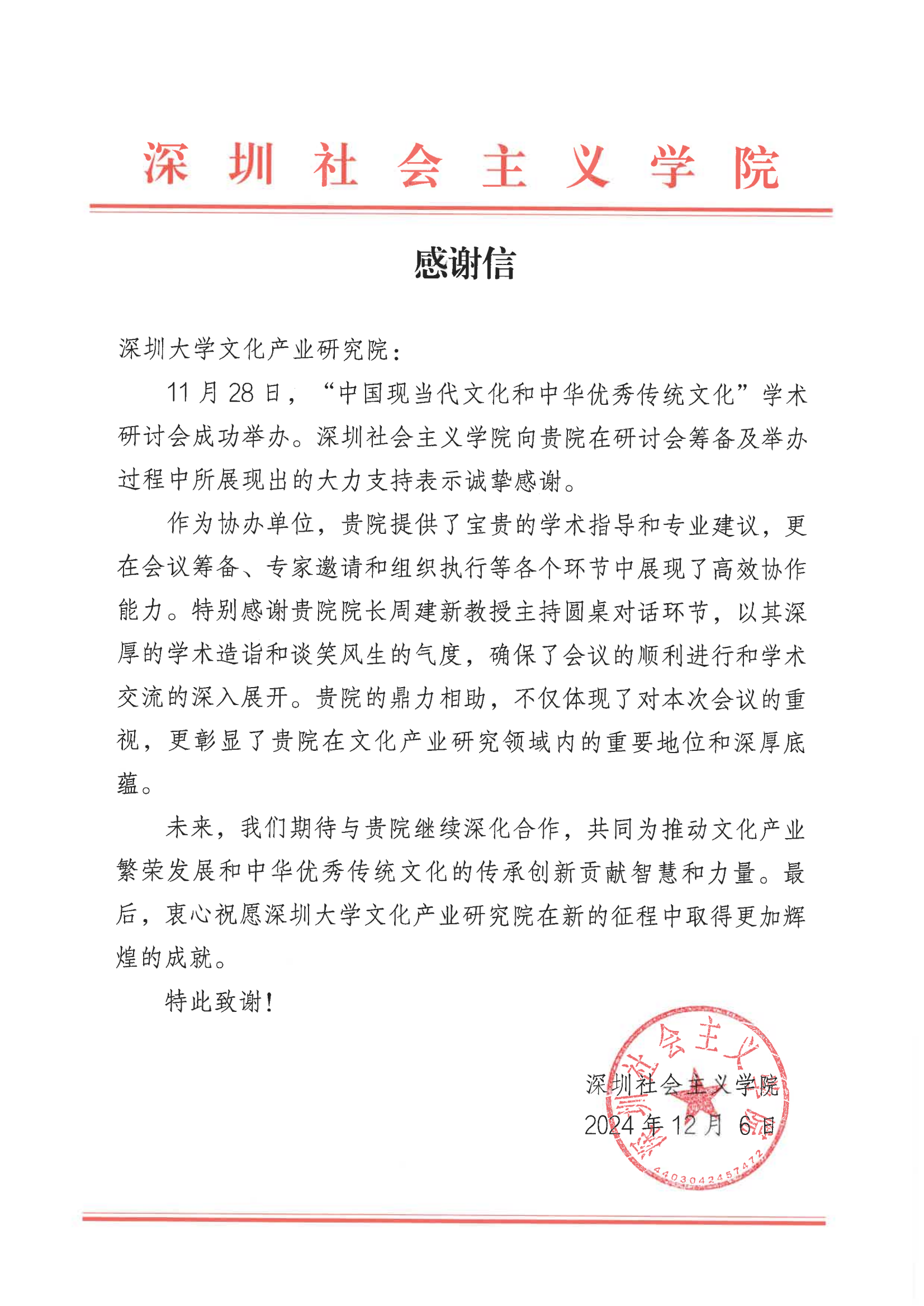 深圳社会主义学院在感谢信中表示,作为协办单位,贵院提供了宝贵的学术指导和专业建议,更在会议筹备、专家邀请和组织执行等各个环节中展现了高效协作能力。特别感谢贵院院长周建新教授主持圆桌对话环节,以其深厚的学术造诣和谈笑风生的气度,确保了会议的顺利进行和学术交流的深入展开。贵院的鼎力相助,不仅体现了对本次会议的重视,更彰显了贵院在文化产业研究领域内的重要地位和深厚底蕴。