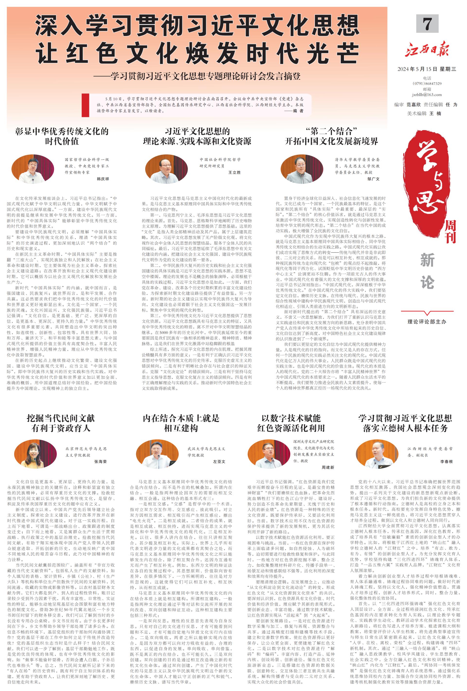 5月10日,学习贯彻习近平文化思想专题理论研讨会在南昌召开。会议由中共中央宣传部《党建》杂志社、中共江西省委宣传部指导,全国红色基因传承研究中心、江西省社会科学院、江西财经大学主办。本版摘登部分专家主旨发言,以飨读者。 ——编 者