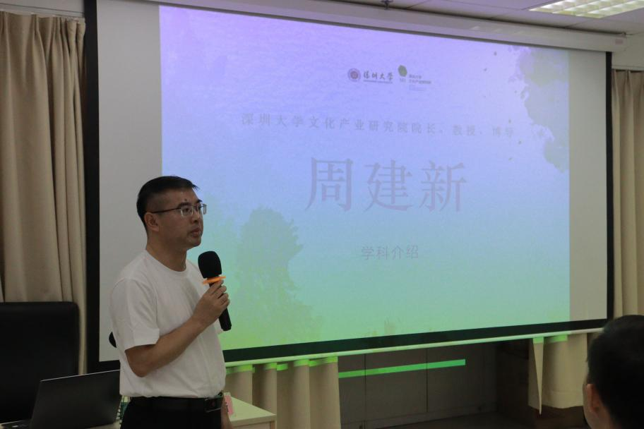 周建新院长提纲挈领式地介绍了深圳大学文化产业研究院的发展历史、专业特色、师资力量、学科建设等情况。强调深圳大学文化产业研究院的教师团队具有学历高、平台多、学科强、实力强、口碑好这五个特点。最后再次对参加此次活动的同学表示热烈欢迎和祝贺。