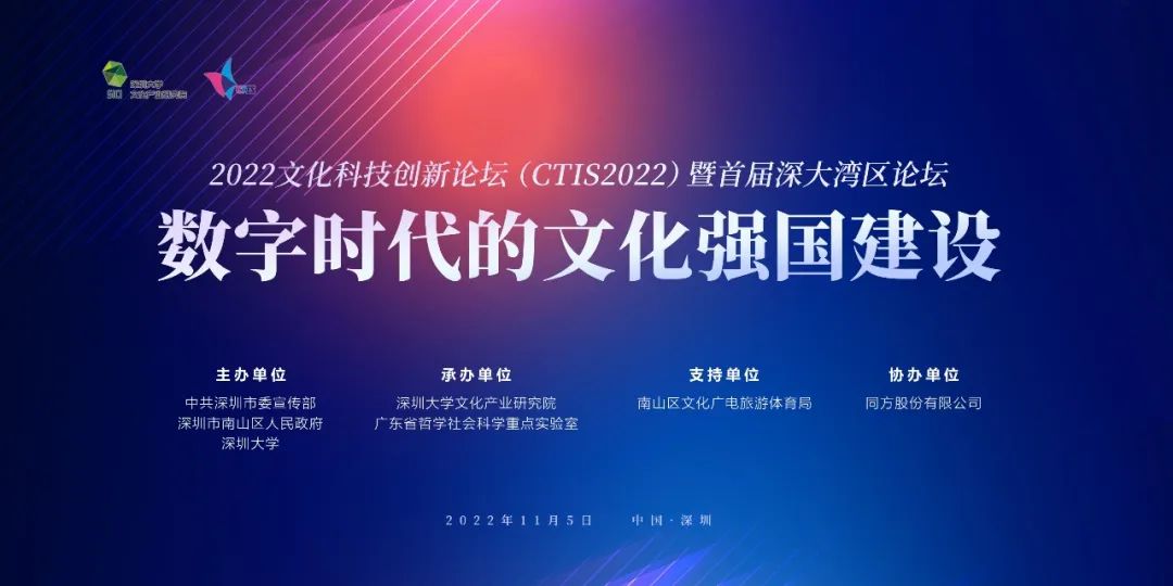 11月5日,由文化和旅游部科技教育司指导,中共深圳市委宣传部、深圳市南山区人民政府、深圳大学主办,深圳大学文化产业研究院、广东省哲学社会科学重点实验室(深圳大学)承办,深圳市南山区文化广电旅游体育局支持、同方股份有限公司协办的“2022文化科技创新论坛暨首届深大湾区论坛”在深圳顺利举办。