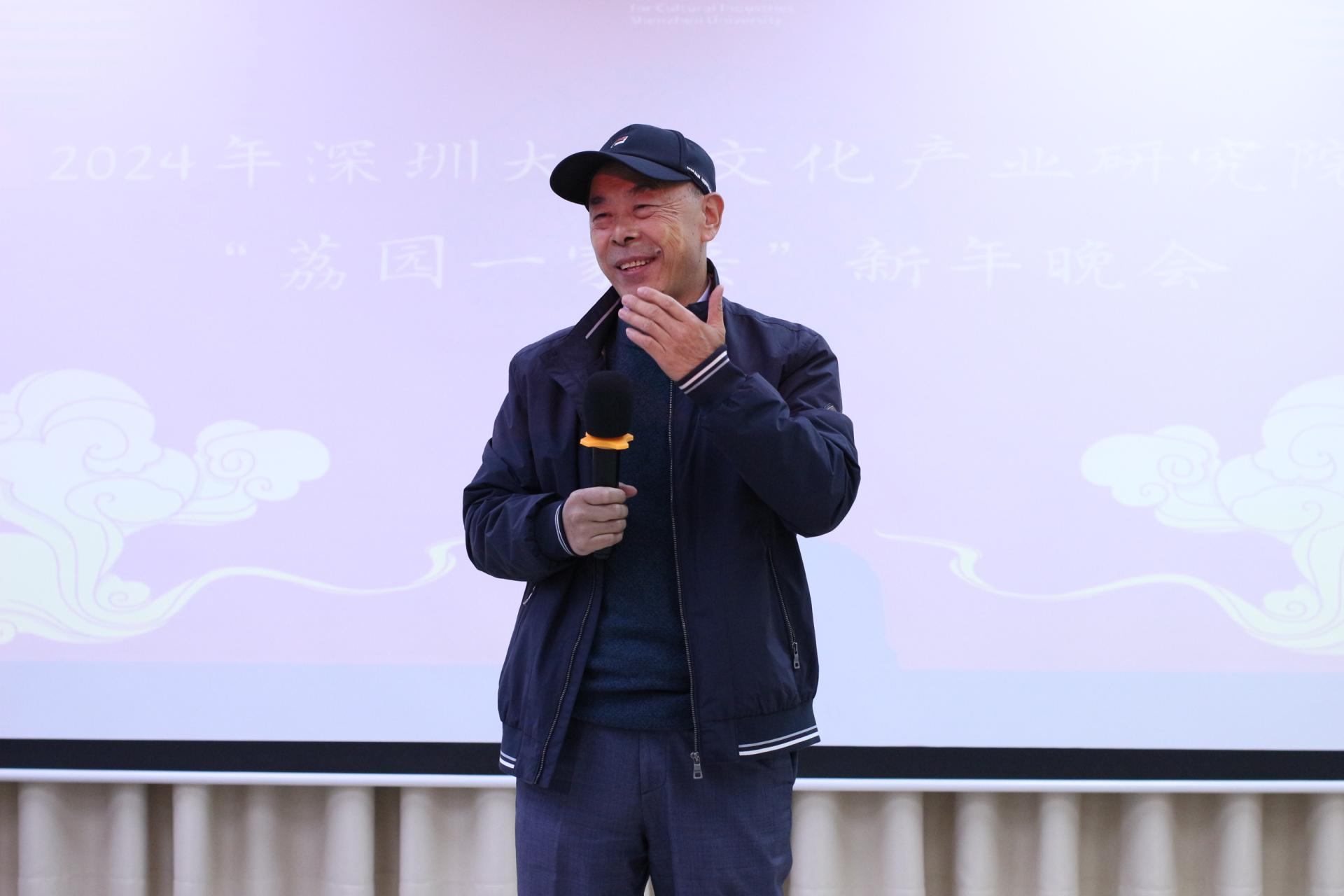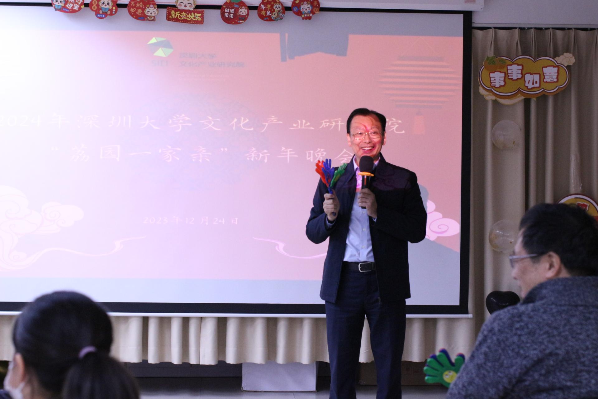 岁序更替,华章日新,2023年12月24日晚,深圳大学文化产业研究院“荔园一家亲”庆元旦暨2024新年晚会在汇文楼5楼2523-4举行。新的一年即将来临,在此辞旧迎新之际,师生欢聚一堂,共同庆祝新年的到来。华南农业大学党委书记李凤亮、美学与文艺批评研究院院长高建平、文化产业研究院院长周建新、文化产业研究院特聘教授李心峰、美学与文艺批评研究院副院长李健、文化产业研究院副院长胡鹏林,以及文化产业研究院全体师生出席参加此次晚会。