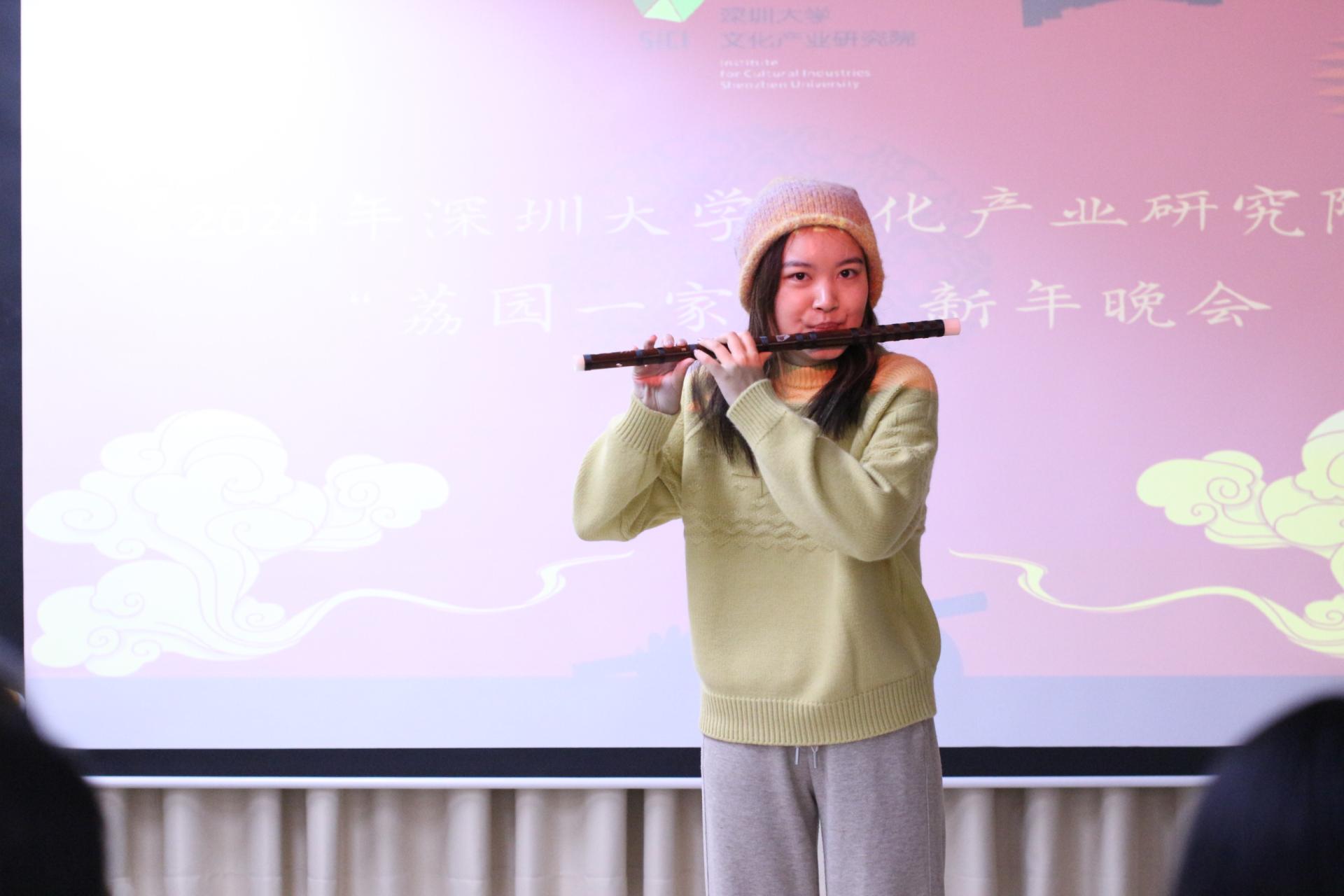 在2021级硕士研究生陆真琳同学演奏竹笛《梦里水乡》中,观众们一起沉醉在竹笛的音乐中,感受着那份宁静与美好。