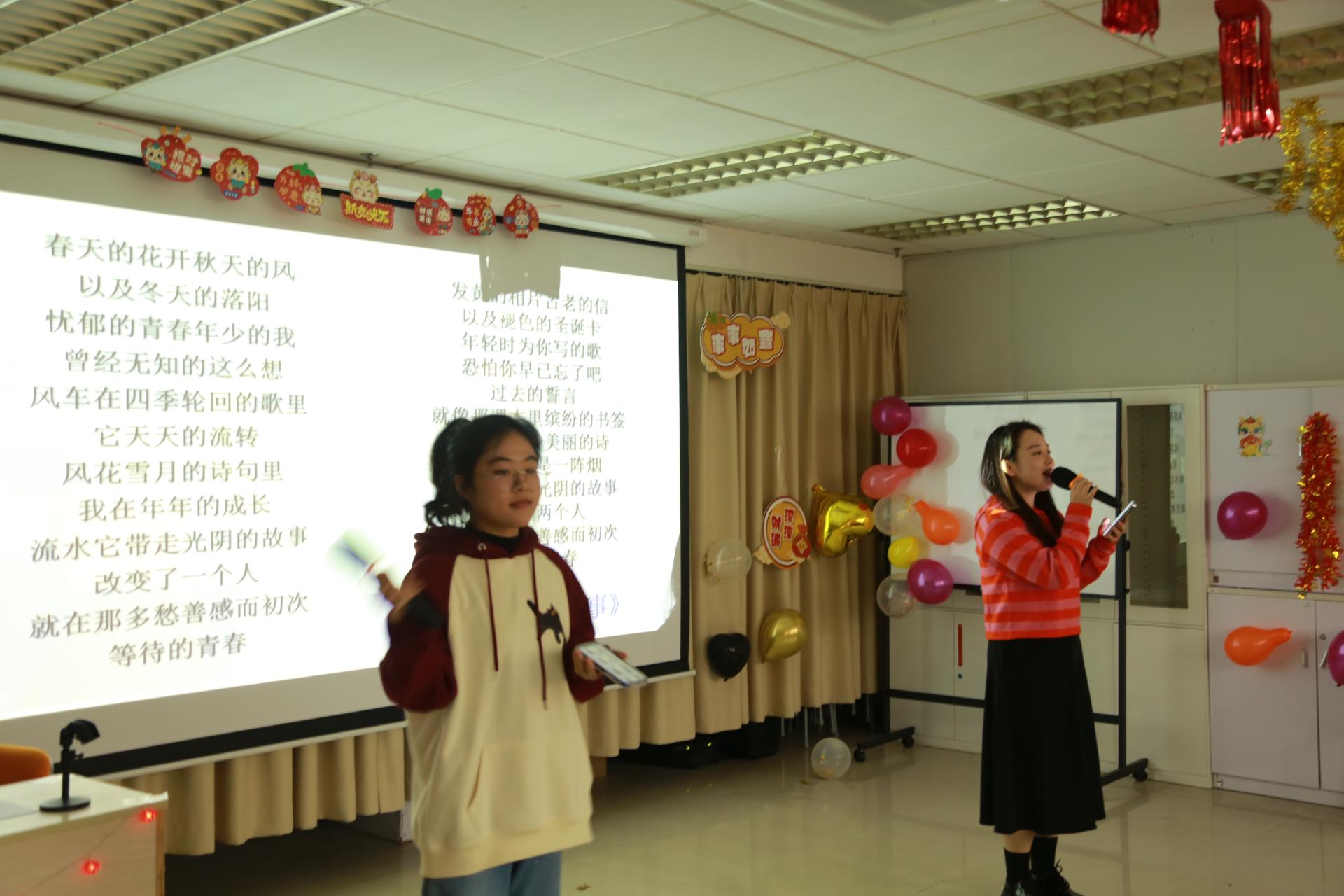 晚会在歌曲《新年序曲》中拉开序幕,2023级硕士生王奕文、葛瑶两位表演者用美妙的歌声为大家送上祝福,歌曲串烧《海芋恋》、《光阴的故事》、《如愿》、《相亲相爱》,轻松愉快、情感真挚,让在场的观众感受到了洋溢的青春热情。