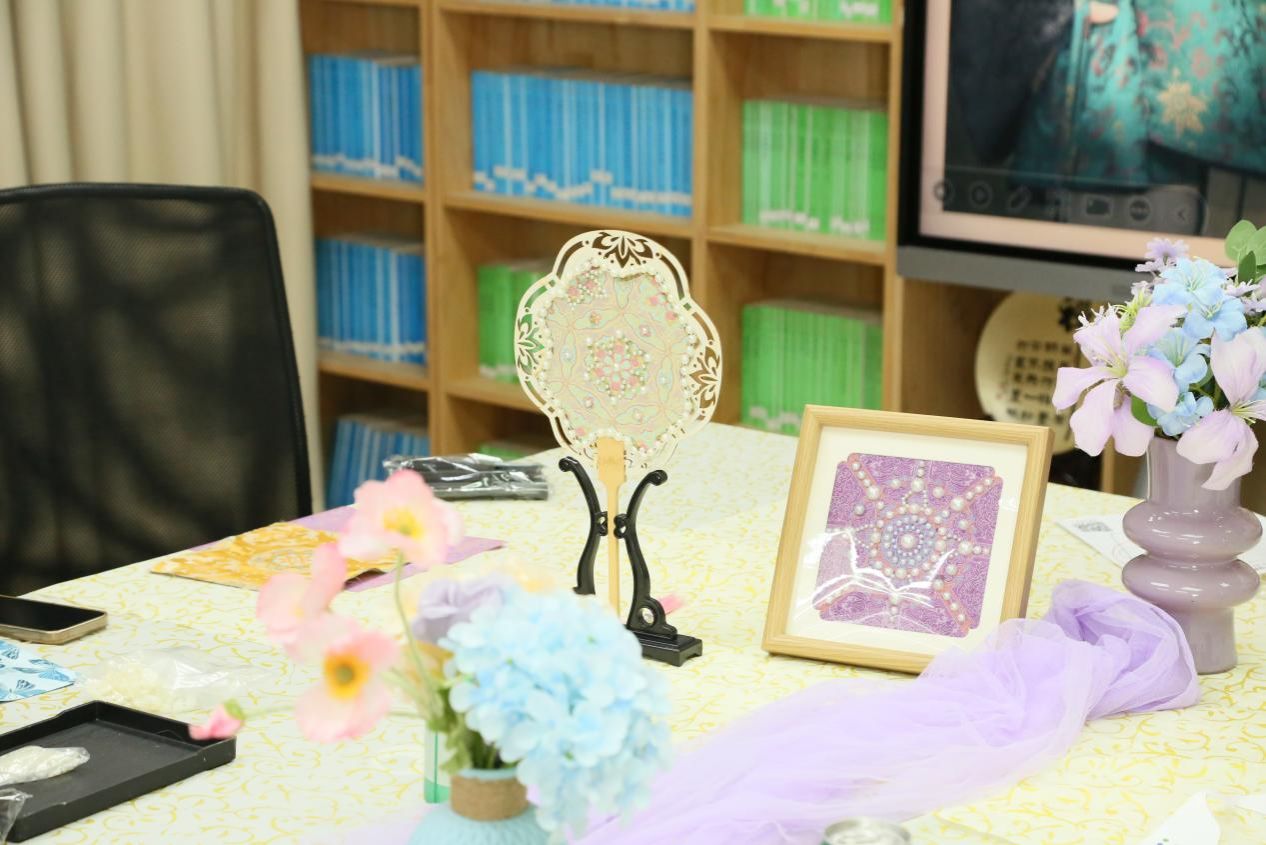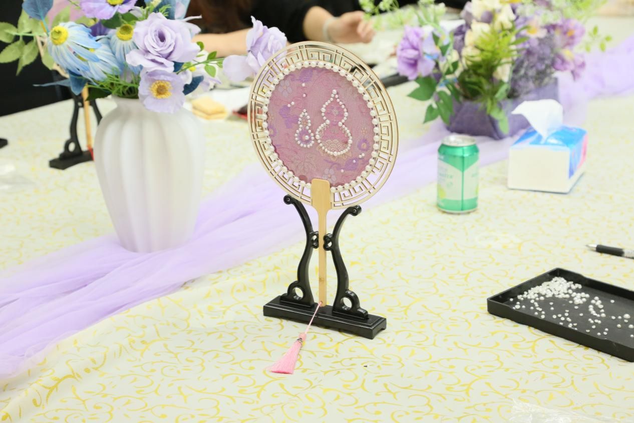 进入手作体验环节,大家纷纷化身“能工巧匠”,将质地细腻的宋锦面料细心粘贴于扇面之上。随后,大家将颗颗温润莹亮的珍珠点缀其间,或沿扇边勾勒,或于锦上生花。经过一个多小时的精心制作,一把把独具匠心的宋锦珍珠扇在指尖诞生。轻摇扇面,既有千年非遗的古朴韵味,又透着清雅别致的时代新风 。