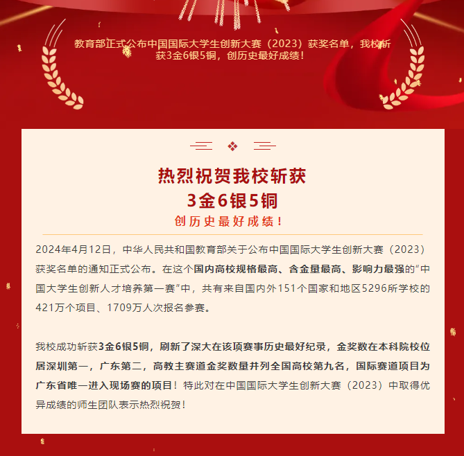 在竞赛方面,实验室也取得了令人瞩目的成绩。2024 年 4 月 12 日,中华人民共和国教育部关于公布中国国际大学生创新大赛(2023)获奖名单的通知正式公布。我校成功斩获 3 金 6 银 5 铜,刷新了深大在该项赛事历史最好纪录,金奖数在本科院校位居深圳第一、广东第二,高教主赛道金奖数量并列全国高校第九名,国际赛道项目为广东省唯一进入现场赛的项目。其中,实验室副主任冯大权老师带领的团队获得了第九届中国国际“互联网+”大学生创新创业大赛国赛铜奖和省赛银奖,展示了实验室在创新创业方面的实力与成果。