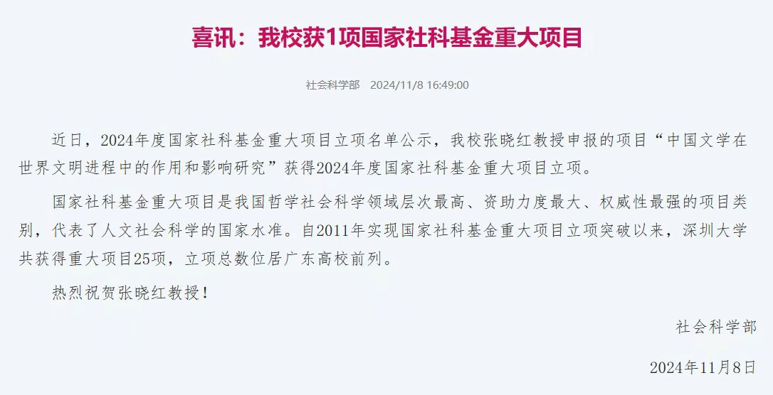 2024年11月8日,实验室主任张晓红教授主持的国家社科基金重大项目获批立项,标志着实验室在课题申报方面取得重大成果,在文化创新领域的研究迈上了新的台阶。该项目将聚焦文学与文明领域,为文化创新的繁荣发展贡献力量。