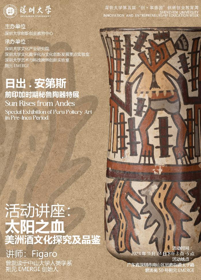 2024年11月24日,深圳大学联合多方机构成功举办“创∙享荔园”第五届创新创业教育周系列活动——“日出·安第斯:前印加时期秘鲁陶器特展”及其配套活动。活动正值亚太经合组织会议在秘鲁召开,国家主席习近平强调中秘交流的重要性。展览由实验室副主任车达及艺术学部师生与朔元EMERGE合作策划,展示了纳斯卡线条、钱凯织物及金巴亚黄金人偶等珍贵艺术品,体现了古代南美洲文化的魅力。活动不仅丰富了创新创业教育周内容,还促进了文化交流与教育的融合,激发了师生的创新思维。