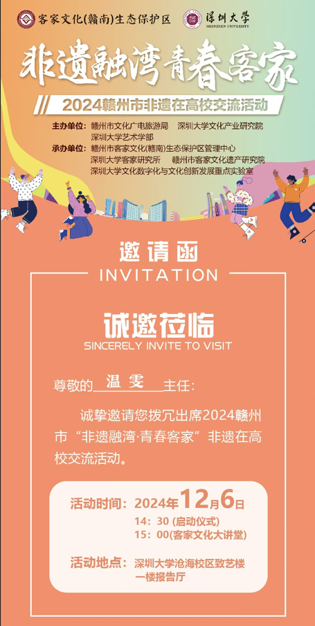 2024年12月,实验室作为承办方,成功举办了两场高水平的学术交流活动。12月6日,“非遗融湾 青春客家”2024赣州市非遗在高校交流活动在深圳大学举行,实验室作为主办承办单位,不仅促进了客家非遗文化的保护与传承,还增强了大学生对传统文化的认同与热爱,为非遗文化的数字化保护与传承提供了新的思路与路径。活动由实验室副主任温雯主持,实验室执行主任周建新代表活动主办单位和承办单位在开幕式上讲话。