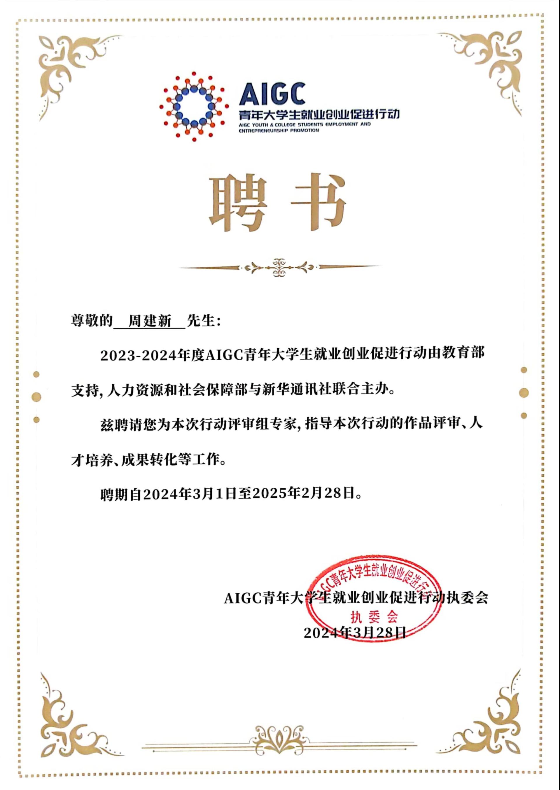 实验室执行主任周建新教授受聘为由教育部支持、人力资源和社会保障部与新华通讯社联合主办的“AIGC大学生就业创业促进行动”评审组专家(2024-2025年)。