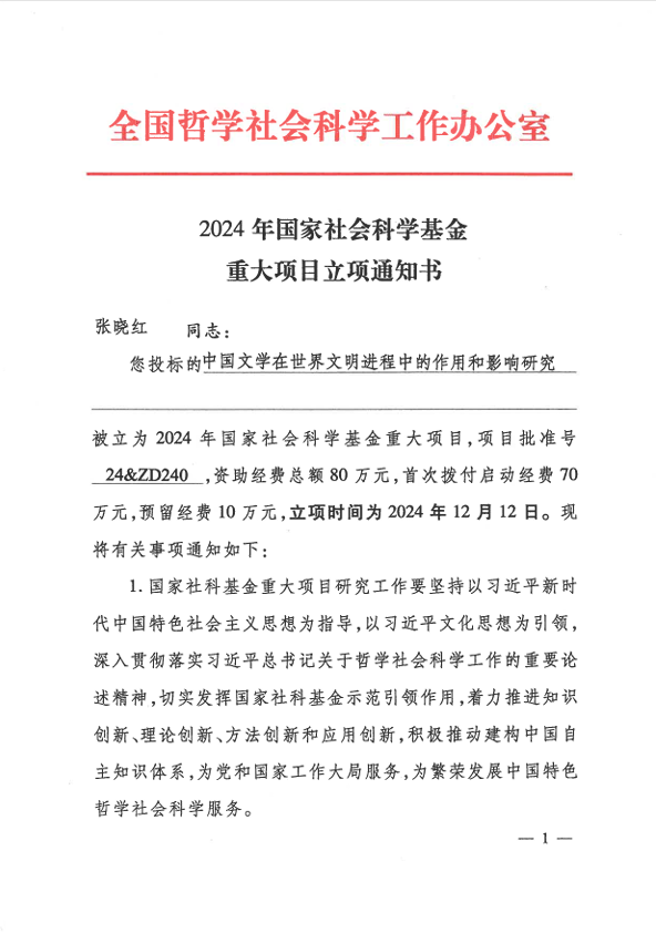 2024年12月,实验室主任张晓红教授主持的“中国文学在世界文明进程中的作用和影响研究”获批国家社会科学基金重大项目。该项目将深入挖掘中国文学的全球影响力,为构建人类命运共同体提供文化支撑,标志着实验室在人文社科领域研究迈上新台阶。