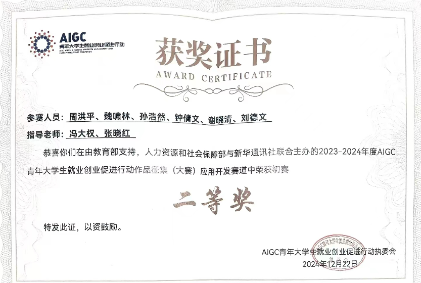 冯大权教授与张晓红教授作为指导老师,在2023-2024年度AIGC青年大学生就业创业促进行动作品征集大赛中荣获应用开发赛道初赛二等奖,展现了实验室在促进青年创新创业方面的积极作用。同时,车达研究员荣获2024年国青杯艺术设计作品展评优秀指导教师奖,进一步提升了实验室在艺术设计领域的影响力。