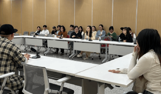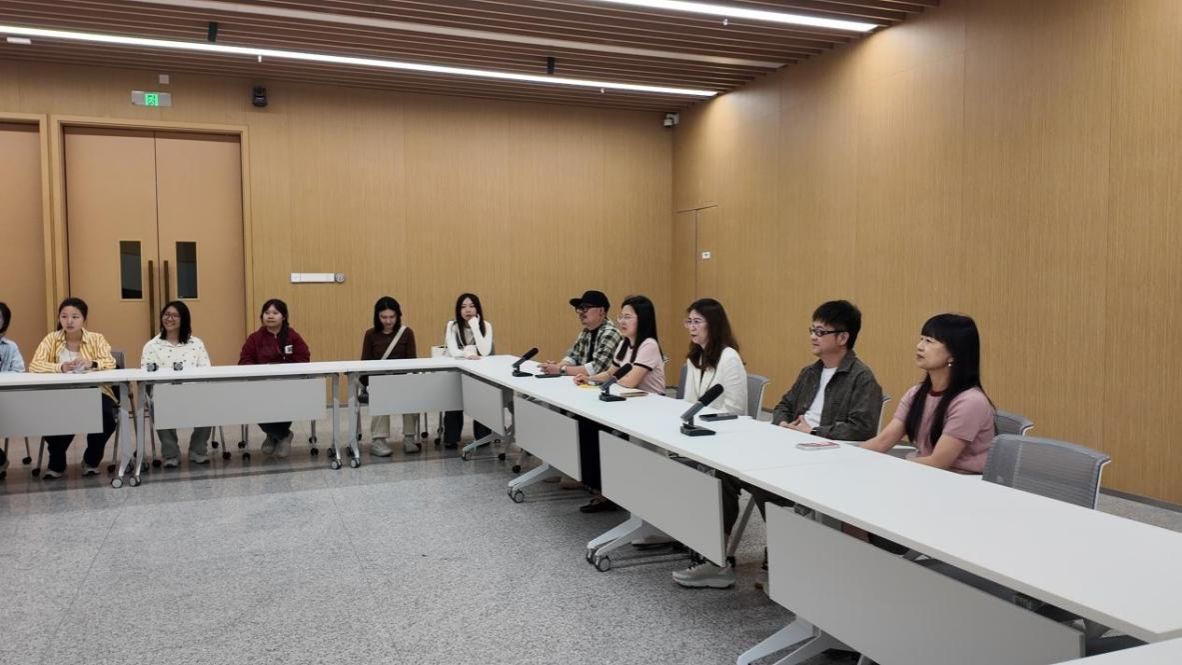 随后,磨馆长、易部长、群艺部部长刘飞飞、培训部部长肖寒竹和总分馆部部长林健与师生展开座谈,双方围绕公共文化服务的创新实践、青年夜校的课程策划逻辑、公共课程设置与群众需求对接、文化馆管理制度等方面展开了深入探讨。坪山文化馆近年来通过推进法人治理结构改革,建立起人员精干、运作高效的治理架构;在内容生产方面,文化馆确立了以“文艺创作营”为核心的精品模式,设立音乐创作营、舞蹈创作营、戏剧创作营三大原创品牌;同时积极推动“文体进四区”,将公共文化服务延伸至社区、校区、园区与厂区,构建全域流动的文化服务体系。这一场面对面的交流对话,让书本上的“公共文化服务”转化为了可触可感的运营细节。