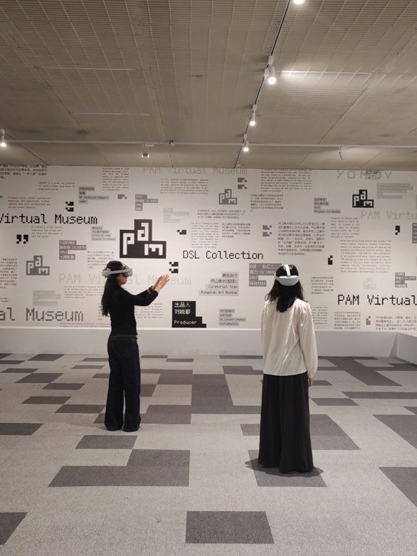 另一重要展览是2025年重启的虚拟美术馆项目。毕竞部长介绍道,项目选取了DSL Collection中8位具有代表性的中国当代艺术家的作品,借助前沿的虚拟技术及设备,重新创作了这一沉浸式数字艺术展览。策展和创作团队将艺术作品分解重构,将动觉参与、身体感官与认知交互介入到原本静态、平面的图像当中,为每件传统形态的作品赋予三维化、情境化、互动化的能力,观众的身份亦被拆解为同时存在的观看者、被启发者、参与者甚至共同创作者。此外,虚拟美术馆还收藏了基于艺术家谢晓泽关于敦煌藏经洞的研究而创作的《神游——藏经洞》项目(Meditation on the Library Cave,2024),将繁杂的历史图像、研究文本和艺术想象融于虚拟时空。不少同学在摘下VR头显后仍驻足良久,感叹于这场跨越时空的精神漫游。