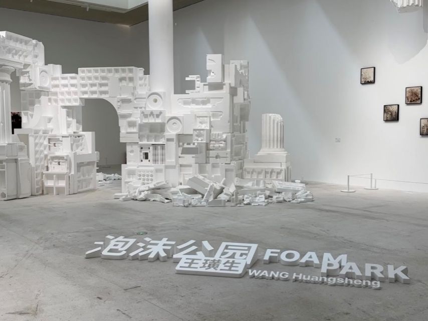 此行适逢馆内正在展出两个颇具分量的展览。其一是王璜生的年度个展《泡沫公园》。展览呈现了艺术家王璜生近年创作的44件作品,涵盖影像、装置以及综合材料绘画等多元门类。“泡沫”既是王璜生艺术创作中反复探索的材料语言(如泡沫塑料、气泡膜等),也是对社会“泡沫化”现象的视觉勾勒——从经济领域的虚假繁荣,到社交媒体中的“人设泡沫”,再到消费主义下的符号狂欢。展览以“公园”的松弛感中和“泡沫”的批判性,让观众在沉浸式体验中,触摸泡沫的物质肌理,感知泡沫背后的社会情绪,最终完成一场关于“解构泡沫、看见本质”的精神漫游。