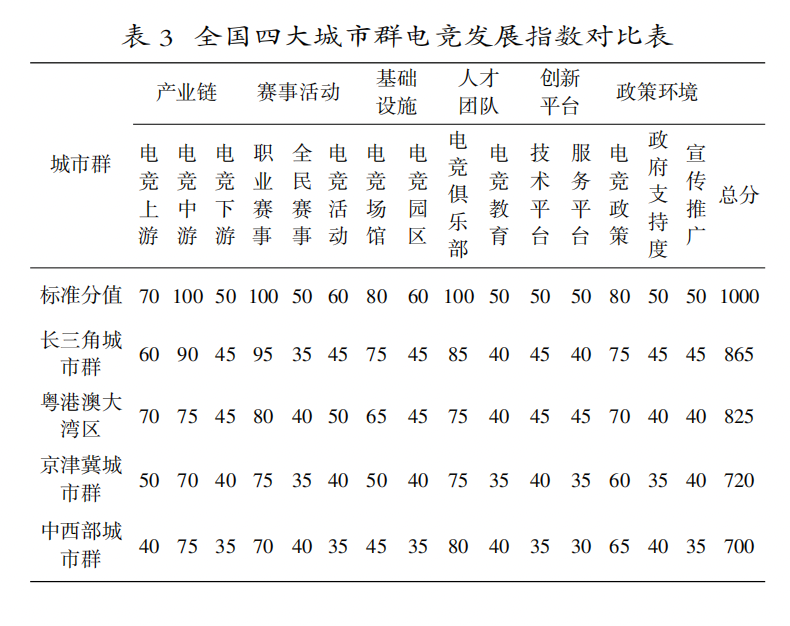 根据2023年度粤港澳大湾区、长三角城市群、京津冀城市群、中西部城市群等全国四大片区城市群在每个二级指标领域的发展情况,我们邀请了10位电竞产业专家给每个城市群的二级指标进行赋分,取每个二级指标的平均分,然后计算出各个城市群的二级指标的总分,并对其进行排序,由此制作出全国四大城市群电竞发展指数对比表(见表3)。