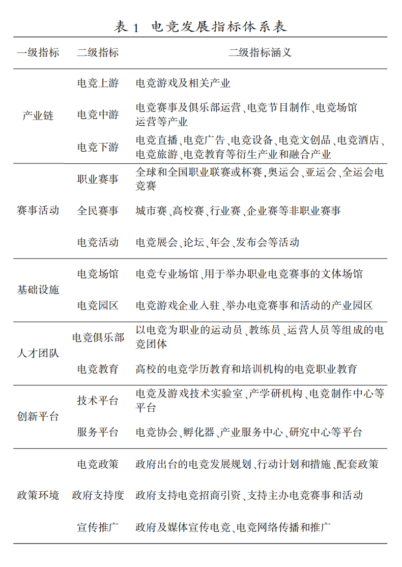 在综合参考现有电竞产业链、电竞发展指标等的基础上,我们按照“三螺旋理论”的框架拟定了电竞发展指标体系,包括一级指标6个、二级指标15个。具体指标体系及涵义参见如下(详见表1)。
